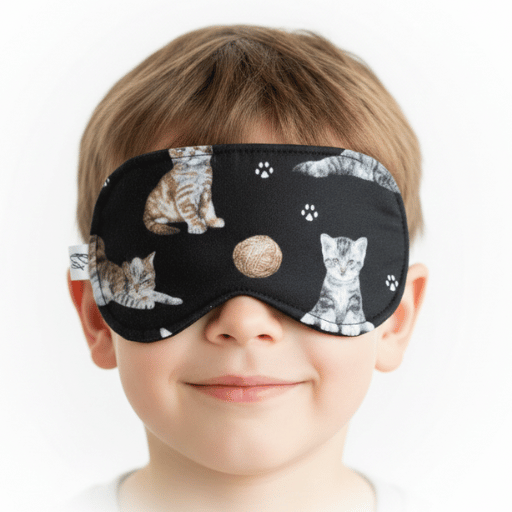 Dziecięca opaska do spania komfortowa drzemka 100 % bawełna – koty na czarnym