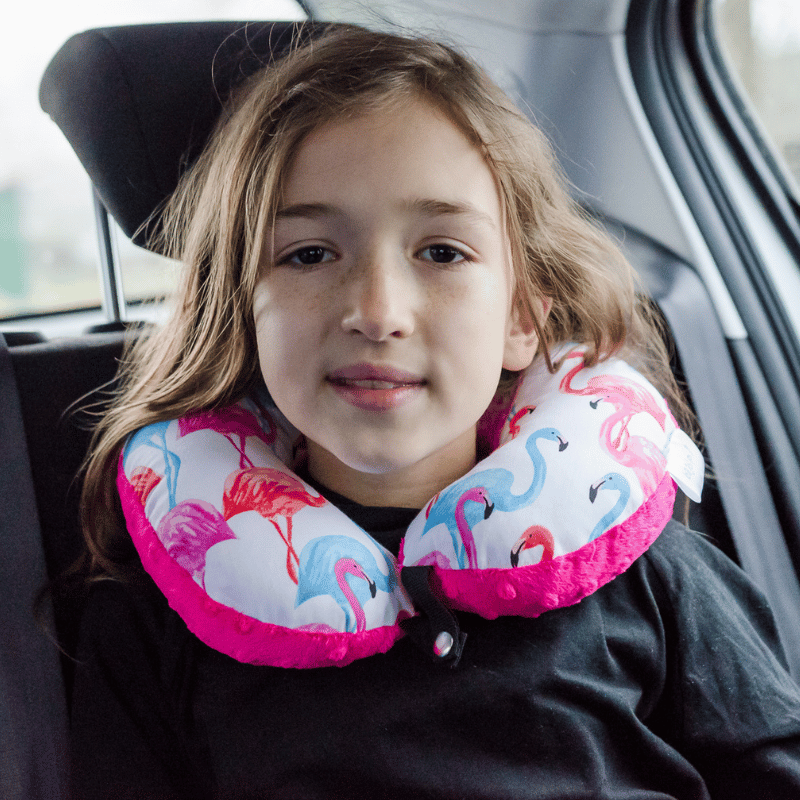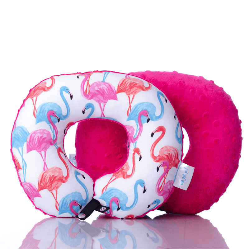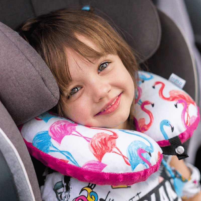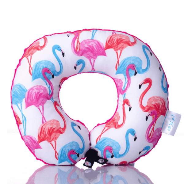 Poduszka podróżna na szyję rogal dla dzieci bawełna minky wygodna – flamingi