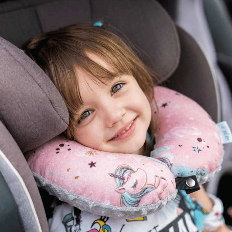 Poduszka podróżna na szyję rogal dla dzieci bawełna minky wygodna – jednorożce różowe
