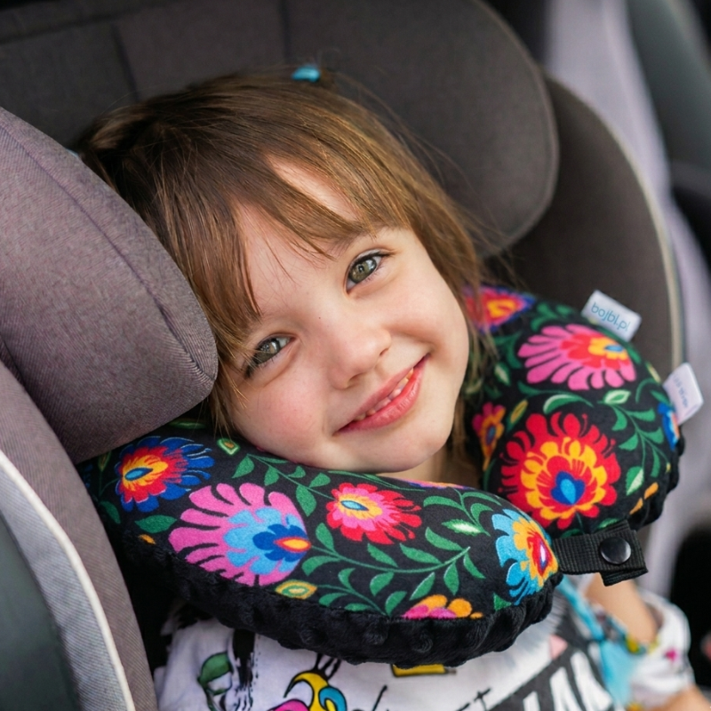 Poduszka podróżna na szyję rogal dla dzieci bawełna minky wygodna – folk czarny