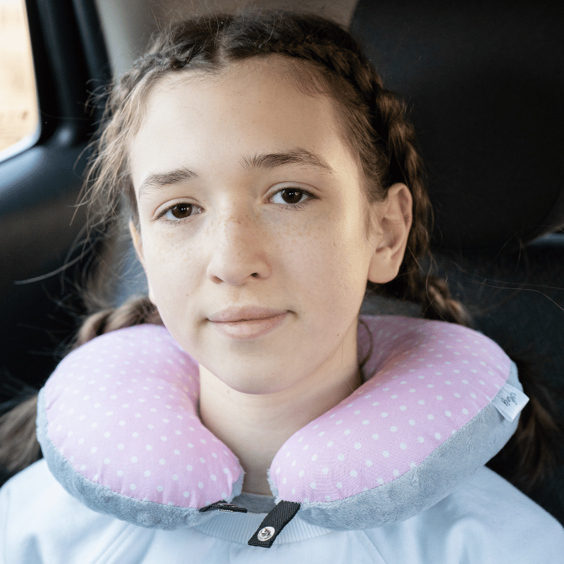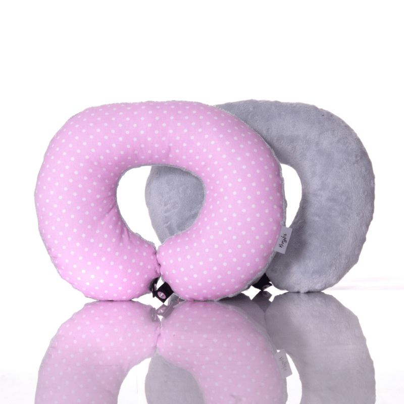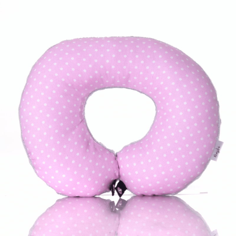 Poduszka podróżna na szyję rogal dla dzieci bawełna minky wygodna – groszki różowe