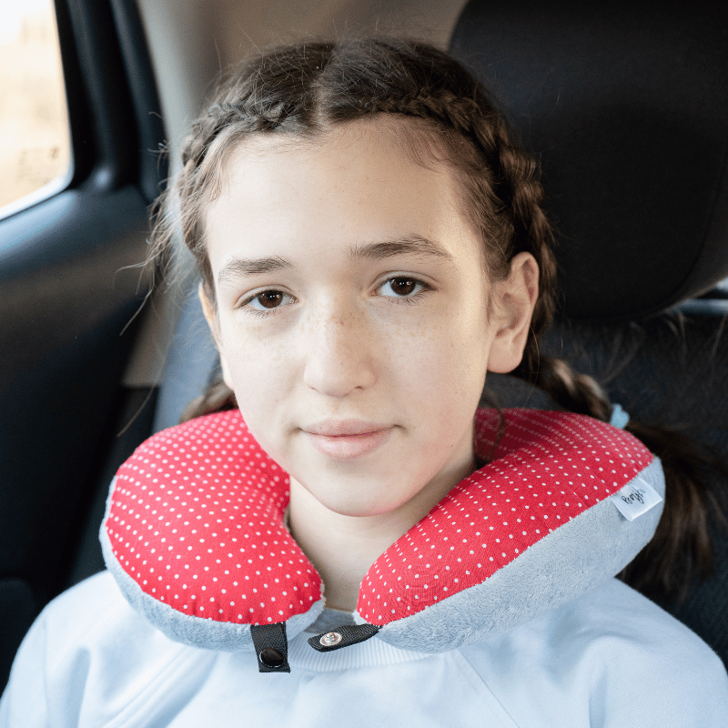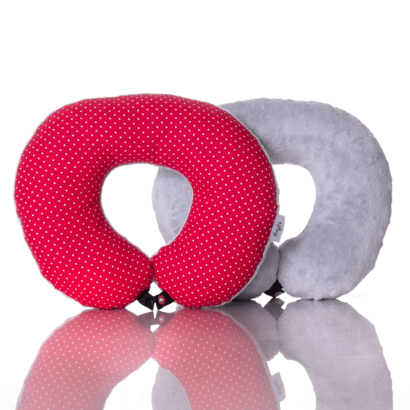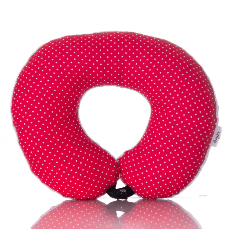 Poduszka podróżna na szyję rogal dla dzieci bawełna minky wygodna – groszki czerwone