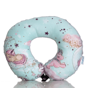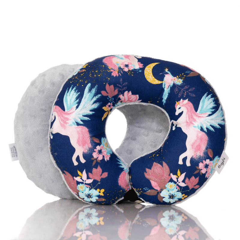 Poduszka podróżna na szyję rogal dla dzieci bawełna minky wygodna – jednorożce granatowe